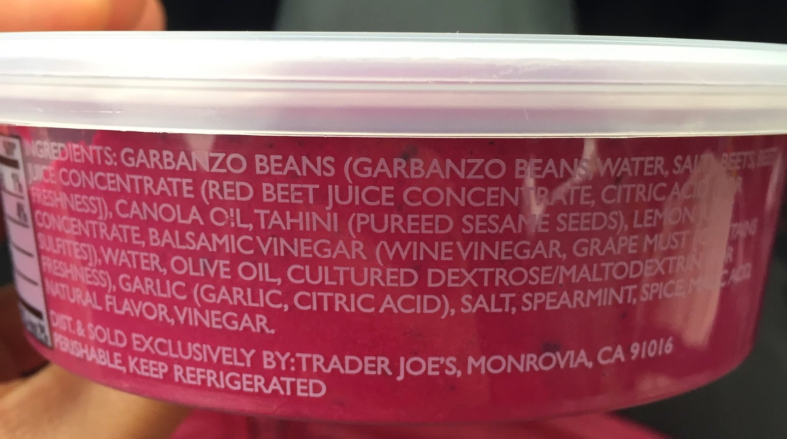 Taste wise, it was pretty good! In addition to lemon, this hummus contains balsamic vinegar, which makes it more tangy/sour/acidic compared to some other TJ's hummus. The beets add a nice sweet overtone, which I found pleasant and refreshing. Considering that beets don't really have too strong a flavor (as opposed to olives, horseradish, or garlic aka the other hummus flavors), I'd say it trends towards a neutral flavor. I dipped it with carrots and cucumbers and also spread it on toast. And yes, WASH YOUR HANDS BEFORE YOU TOUCH ANYTHING ELSE AND SPREAD THE BEET JUICE EVERYWHERE.